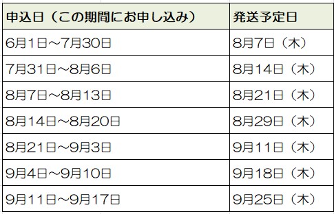 お申し込み時期によって発送日が変わります。(発送日は予定です。)